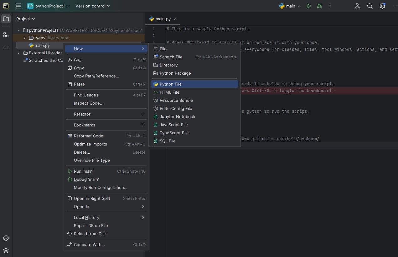 В левой части окна (сайдбаре) будет отображена структура вашего проекта. Сделав правый клик по названию проекта, можно открыть меню для создания нового рабочего файла: